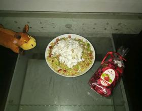 再放入火腿丁,笋丁,翻炒之后把葱花放在饭中间,把葱花盖上,用铲子把饭扒拉到一边,把蛋清炒熟,翻炒,放盐出锅,蛋清放在炒饭上