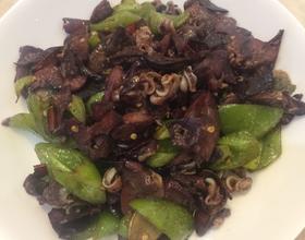 炒到羊肺变色 变小 倒入绿辣椒 继续爆炒 此时加入盐 (少许 我买的是半成品羊肺 所以少许盐即可)鸡粉适量