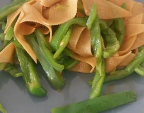 锅内热油,放入一点点花椒面,放入青椒炒10秒,放入干豆腐翻炒几下淋入调味汁,翻炒均匀出锅即可。