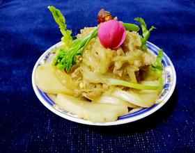 猪肉切成片或者丝儿均可,用生抽煨制10分钟;