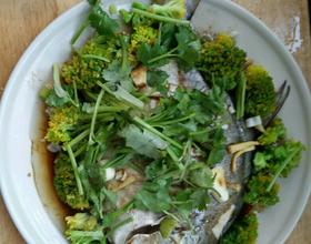 西兰花焯水后摆在蒸好的鱼周围,把葱姜蒜洒在鱼的表面。