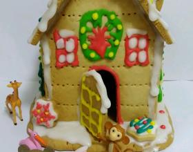 - 16. 漏了一道工序,烤好的面皮晾晾,开始组装。先把墙壁围起来,用糖霜固定,做好烟囱,手一定要轻,手动辅助一会,只要不再散开,就让它静静地呆在那里慢慢凝固。