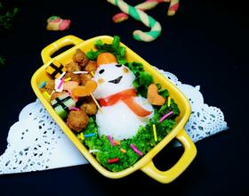 - 12. 将两个米球沾一起,西红柿皮剪窄条当围巾,胡萝卜根部切下当雪人帽子,海苔剪成两个小黑眼睛和嘴巴。插上图9里两个小手。用山楂酱点腮红,雪人部分完成。