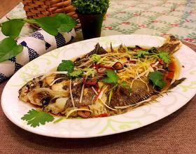 鱼蒸好后将盘中汤汁倒掉,去除蒸鱼时的葱姜,将鱼小心移到干净鱼盘中,撒上泡好的葱丝和姜丝,淋上蒸鱼豉油
