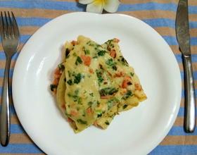 平底锅里放油烧热,舀一勺面糊摊在锅中。