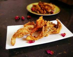 记得翻面,表面变硬并且微微发黄,平菇都浮上来后转大火炸十来秒钟