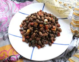 倒入沥干水的山药蛋继续煸炒,等待山药豆熟透,添加孜然,盐和十三香,胡椒粉,泡椒水少许。