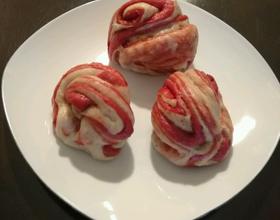 再把紫菜头汁发面团擀成片,摞在白面片上。