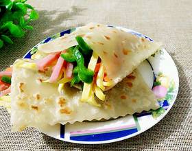 面片,要擀得越薄越好。填充的材料,依自己口味喜受决定。也可加一些酱料、香葱,香菜,其他肉类。我用开水烫的面,煎熟的饼酥脆中带有韧性。烫面的水最好事先称好,再烧开,倒入后不多也不少
