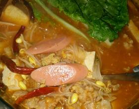 - 2. 食材准备:粉丝泡开、大葱切断、瘦肉切片加芡粉拌匀、豆腐切片、豆芽洗净、肉沫拌好调料做肉圆子、火腿肠切片