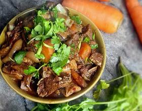 胡萝卜炖煮一个小时左右后,撒盐糖调味,撒上香菜即可装盘出锅