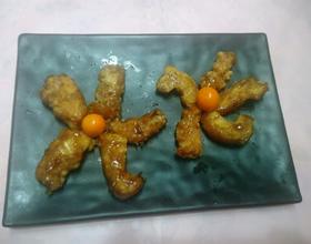 锅底留油,油温七八成热,将裹好的肥肉条下锅炸至金黄。