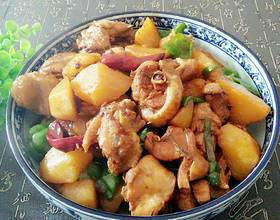 倒入鸡块加葱段、糖、甜面酱干炒10分钟
