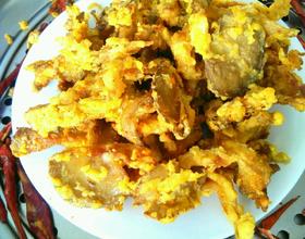 等油温时,往腌好的平菇中放入鸡蛋放些面粉挂糊