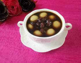 - 8. 将糯米圆子用漏勺捞入红糖水中,稍煮片刻,上色,停火