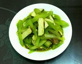 烧煮到汤汁浓稠后,洒入鸡精调味就可以盛入盘子,这样一盘西芹豆干就做好了,很是爽口!