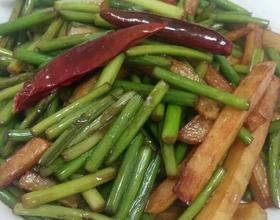放入蒜苔翻炒至基本成熟。调入生抽,一点点水。