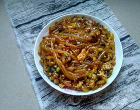 粉条容易粘锅,炒的时候要放水进去,喜欢酸辣口感的可以加点醋进去,生抽本来就咸,烹制时候要加少量的盐!