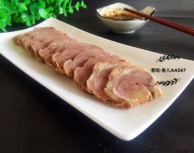 压好的马肉捞出沥干水份,切片,蘸蒜末酱油辣椒油调成的蘸料食用。