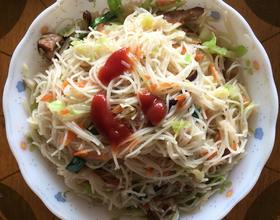油烧热,放鲜蒜苗头爆香,放入三层肉,然后依次倒入圆白菜和胡萝卜丝、香菇丝、虾米翻炒出香味后加酱油和盐,最后倒入泡好的米粉,翻炒,此时火调小点以免粘锅,起锅前倒入鲜蒜苗叶,炒两下即可起锅,大功告成。