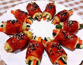 拿一片培根铺上土豆泥 再把蔬菜放好