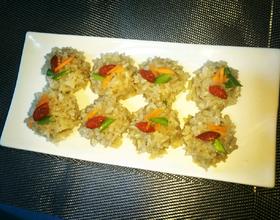 装盘在丸子上面摆上枸杞子胡萝卜丝和葱花