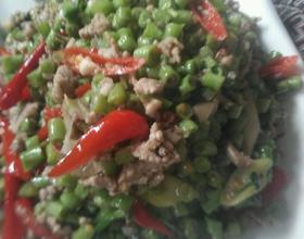 放入豇豆角,炒均匀后,依次加入盐,鸡精,胡椒粉,大火翻炒。至豇豆角软即可,少许香油,翻炒均匀出锅装盘。