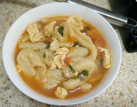 锅内倒入了开水烧开,水烧开后放番茄滚滚。一定要蜕皮后取出,切小块如图2
