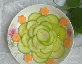 开火,锅干放油,放入姜丝,西葫芦,煸炒。看颜色好后,摆放成花的形状