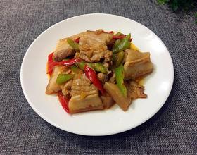 五花肉洗净切成薄片,青红辣椒切成小块,蒜、姜切末,葱切葱花备用