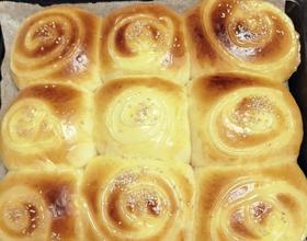 - 13. 做好的面包胚再进行第二次发酵,在烤箱的底部放一碗热水,装面包胚的烤盆放入中层。