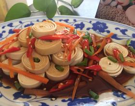 把千张 胡萝卜 朝天椒放盘子里摆放好