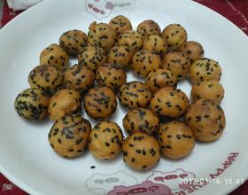 再把它分成一小个,用手把它搓圆。在小碗里放点黑芝麻,就可以摇它了。(我是两个人做,一个负责搓,一个负责摇)