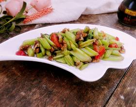 翻炒至菜断生,放入核桃仁,放少许盐鸡精出锅装盘!