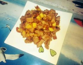 锅内加少许水,糖,醋,熬成浓稠的汤汁下肉西红柿菠萝块翻炒均匀
