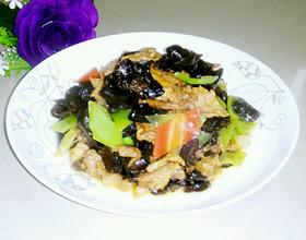放入姜蒜片,木耳,青笋,胡萝卜翻炒,在加入李錦记天成一味鲜酱油翻炒