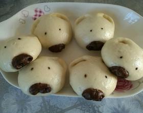 两边捏一下当耳朵 两个芝麻做眼睛 放上鼻子用筷子筒两个空小猪就做好了