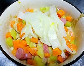 - 4. 锅中加底油,烧三成热,下葱姜爆香,倒入胡萝卜丁、西葫芦丁翻炒2分钟,下香肠翻炒,加水没过臊子,加热至八成熟,加适量盐,醋,少量生抽