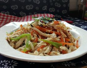 - 6. 将段生的黄瓜丝和胡萝卜丝放入大碗中,将已拍散的鸡胸肉,撕成细丝。