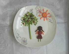 红萝卜切小块薄片,放红枣旁边。再把少许红枣切小块,放树点缀。
