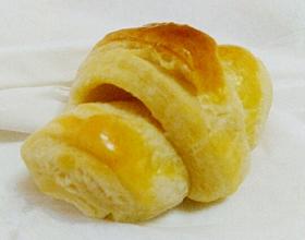 将三角形的底部到顶部,卷起来,如图所示,卷成牛角形, 将其放入烤盘中,发酵一个半小时。一个半小时后,在上面撇上蛋液放入烤箱二百度十分钟,十分钟后从烤箱中拿出在上面覆上一层铝纸。再次放入烤箱。两百度十分钟。没有拍照片,对不起了