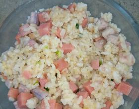 香芋切丁蒸20分鐘,火腿切丁,蔥切小塊,熱鍋後加入蔥花,倒入火腿和香芋,接著倒入飯,略炒一下,加點醬油即可!