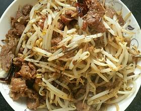 放入炒好的羊肉和豆芽继续翻炒后可再放适量的孜然