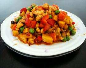 鸡丁上浆的过程一定要做,滑鸡丁时油不要太热,让鸡丁保持嫩度。配菜可以根据家人的口味调整,这次选的配菜中有嫩南瓜,是脆嫩的口感,不是老南瓜那种软糯的口感,如果没有可以更换为黄色的彩椒。