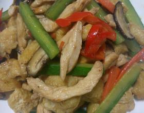 黄瓜、胡萝卜切条,香菇切片,红辣椒切丝,油豆泡切开