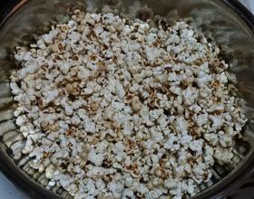 爆米花爆好后找一个无水的大盆倒入摇晃一下,这样脆脆甜甜的爆米花就可以分享了~