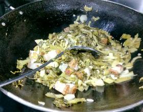 先热锅,放油、蒜头爆香,再把芥菜放进去炒,最后倒入调好的配料