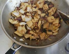 炒啊炒,然后放辣椒面,酸腌菜,酱油,白糖,盐。直到手酸啦,哦,不,饵块软啦,你就做好啦。