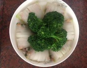 在中间摆上己焯水的西兰花,再蒸一分钟出锅。