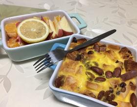 - 8. 将混合液倒入陶瓷餐具中 尽量使每一块面包丁都浸泡着